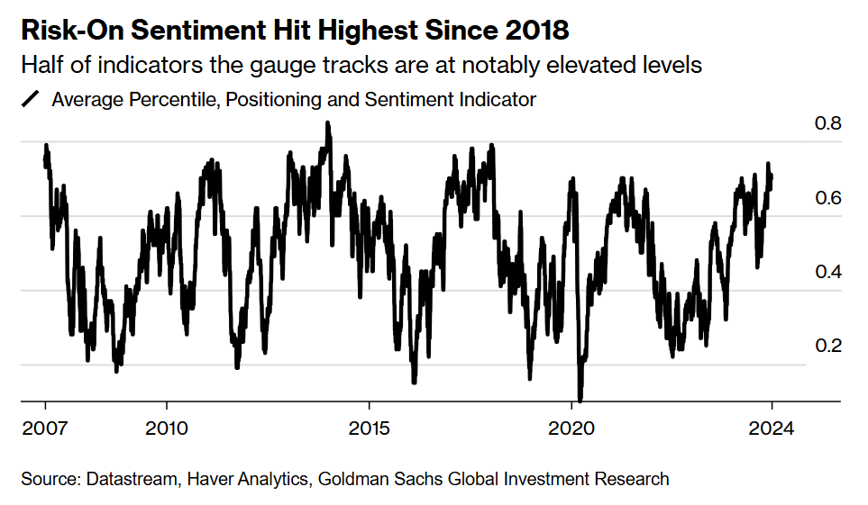 An indicator shows the market is stretched. Goldman Sachs Group tracks risk-on positioning and mood. It tracks flows to equities futures and optimistic stock options. More than half of those indicators are at significantly elevated levels, and the risk-on sentiment gauge has hit its highest since 2018. A reversal has followed comparable readings.