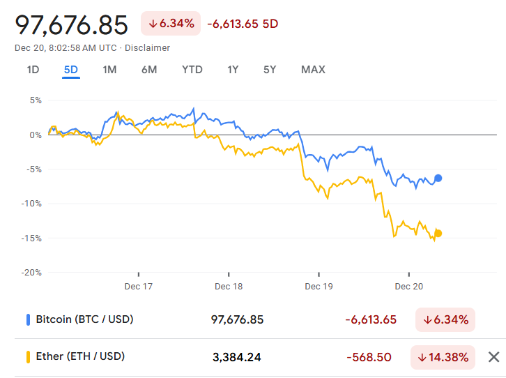 As briefly mentioned, Bitcoin and Ethereum haven't had the best of weeks with the former down 6.34% and the latter sinking 14.38%.
