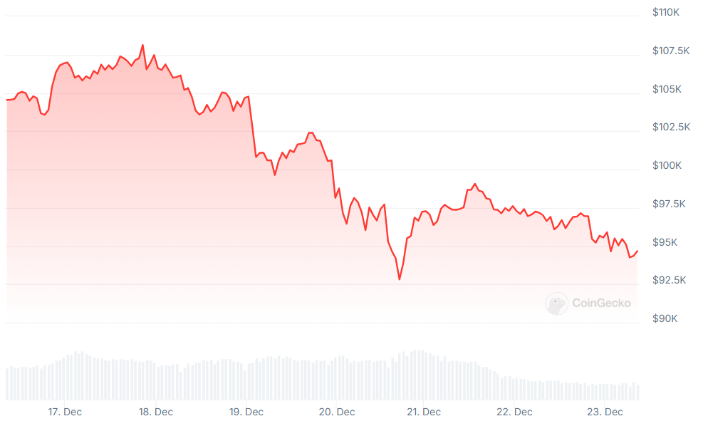 The original coin was trading at about $94,344, almost $14,000 lower than its record high on December 17. Still, the token has been up over 37% since the election results on November 5.