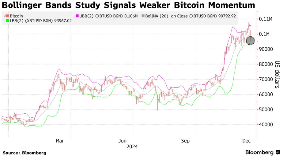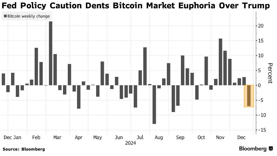 Bitcoin suffered its first weekly decline since Trump's election win in early November after the Federal Reserve's hawkish pivot on Wednesday to fewer rate cuts next year than predicted earlier. The token fell about 7% last week, marking the biggest drop since just before the Fed's large cut to start its current easing cycle in September.