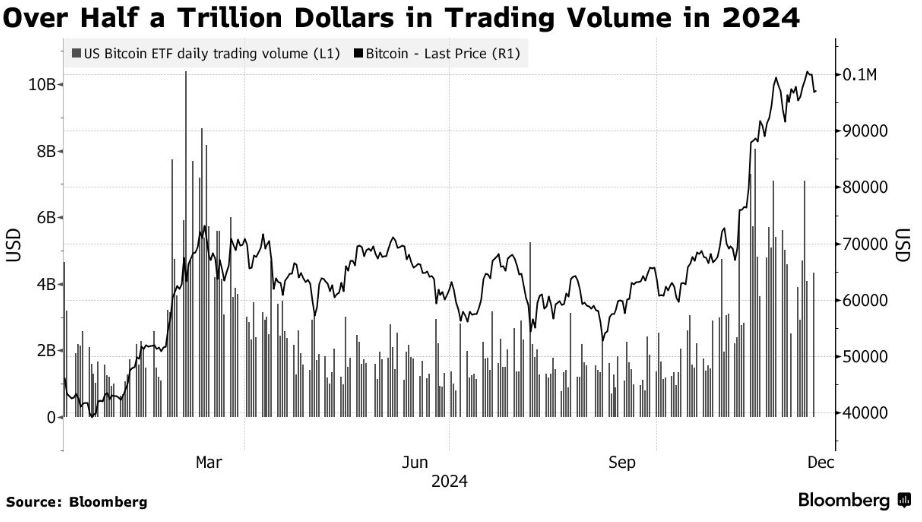 Since its inception in January, US Bitcoin ETFs have had net inflows of over $36 billion and a total daily trading volume above $500 billion.