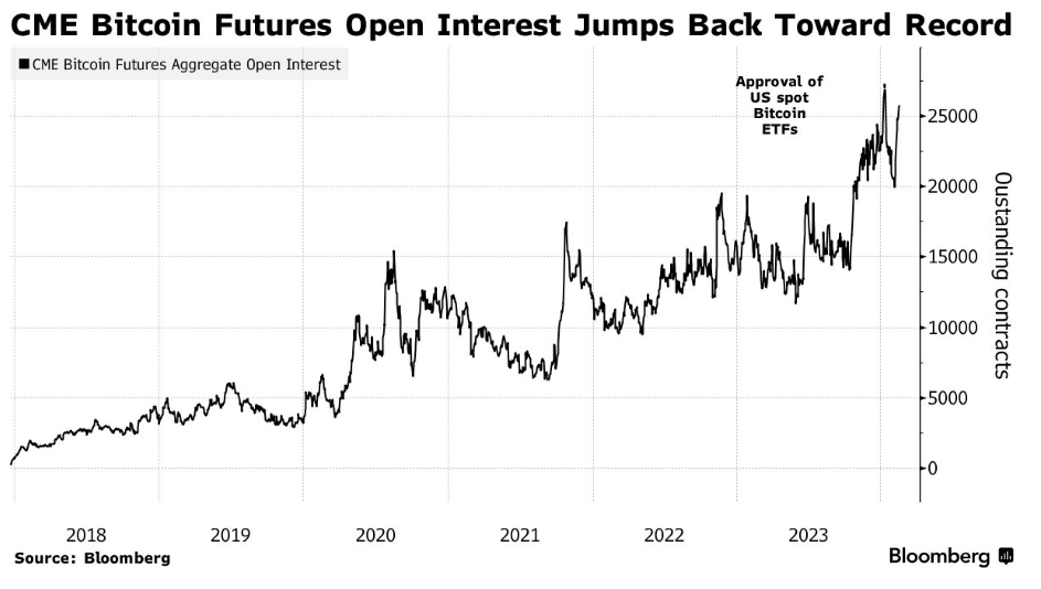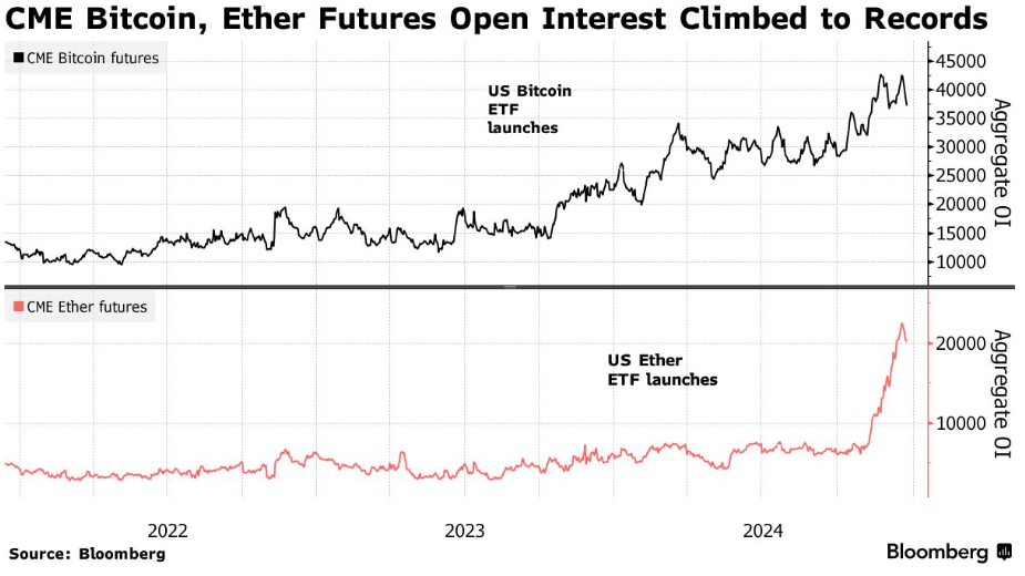 Earlier this year, the Chicago-based CME Group reached record highs for open interest, also known as outstanding contracts, for Bitcoin and Ether futures.