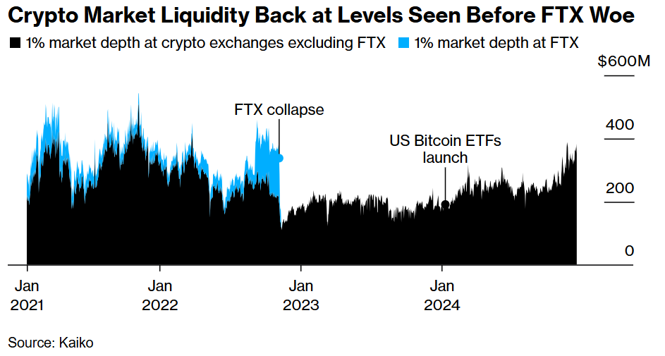 According to Kaiko data, the crypto market depth has returned to levels recorded before the FTX crisis, effectively closing the so-called Alameda gap.