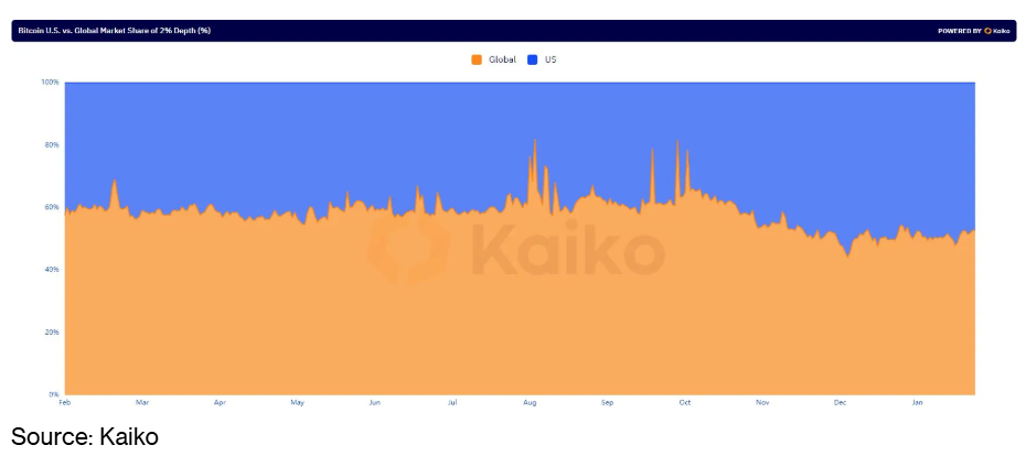 Research firm Kaiko discovered that, on average, over 50% of all bids and offers within 2% of Bitcoin's mid-price this year—coinciding with the launch of US spot ETFs—occurred on US trading platforms.