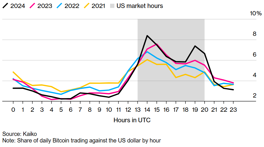 Compared to 2021, when data from Kaiko shows that 40% of daily Bitcoin trading in dollars during US hours, the share during US hours now is approximately 53%.