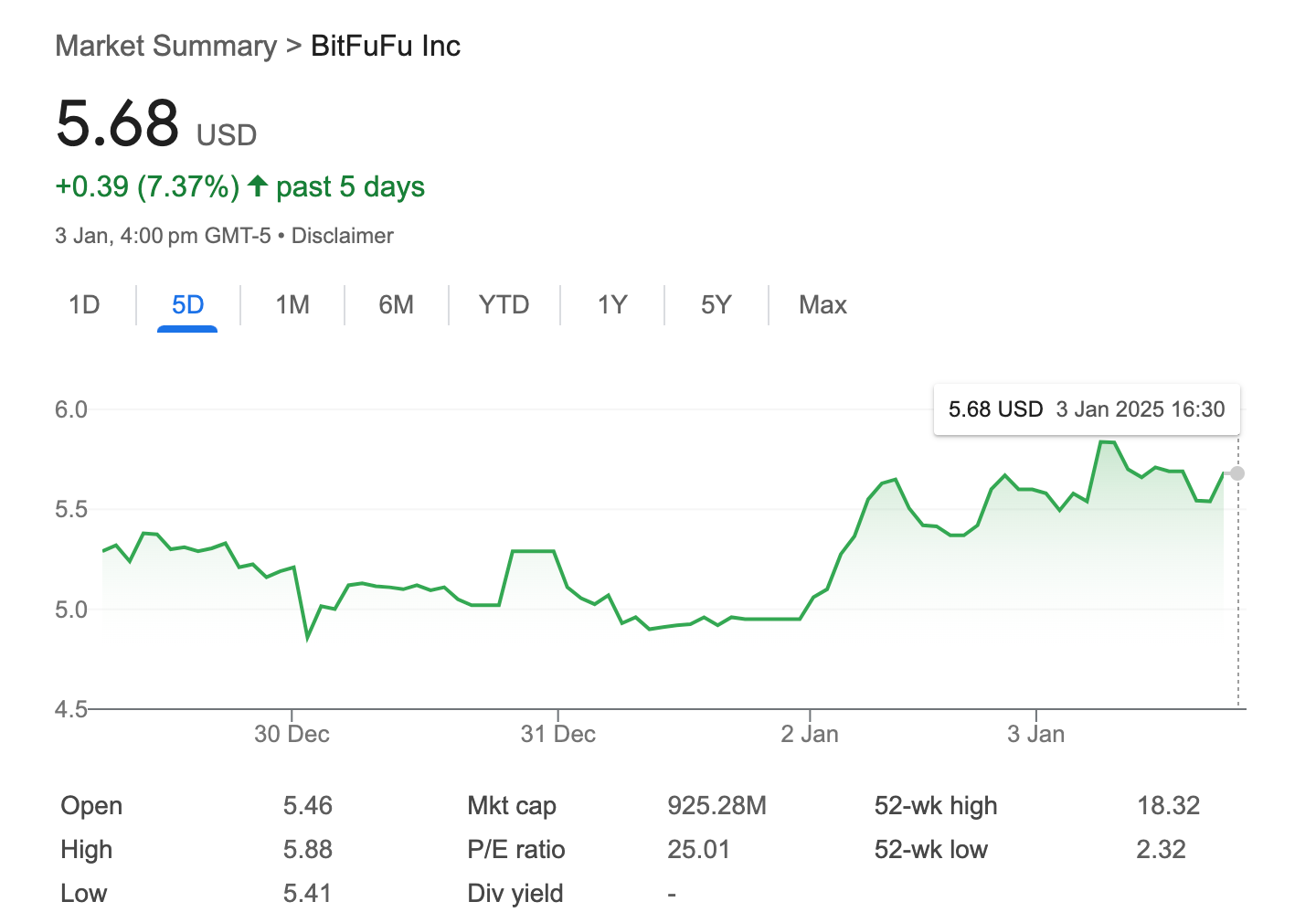 The announcement was met with enthusiasm by investors, driving a significant boost in BitFuFu's stock price, which ended 2024 at $4.95, and now sits 14.75% higher at $5.68.
