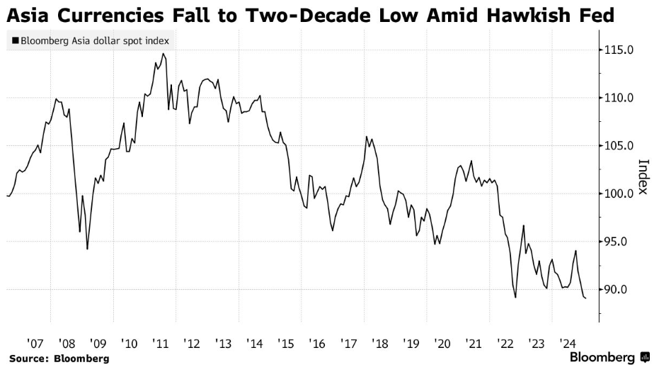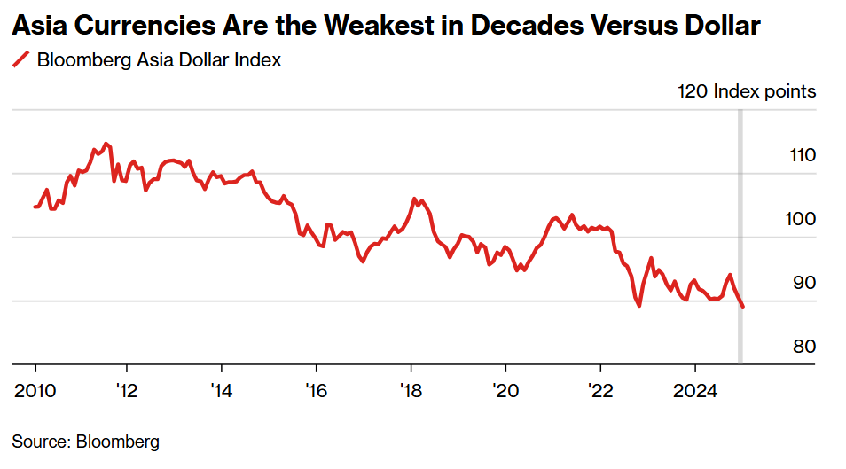 An Asian currencies index hit a two-year low, reflecting bets favouring the dollar under Trump 2.0. On Monday, the Bloomberg Asia Dollar Index declined to a level not observed since data recording in 2006.