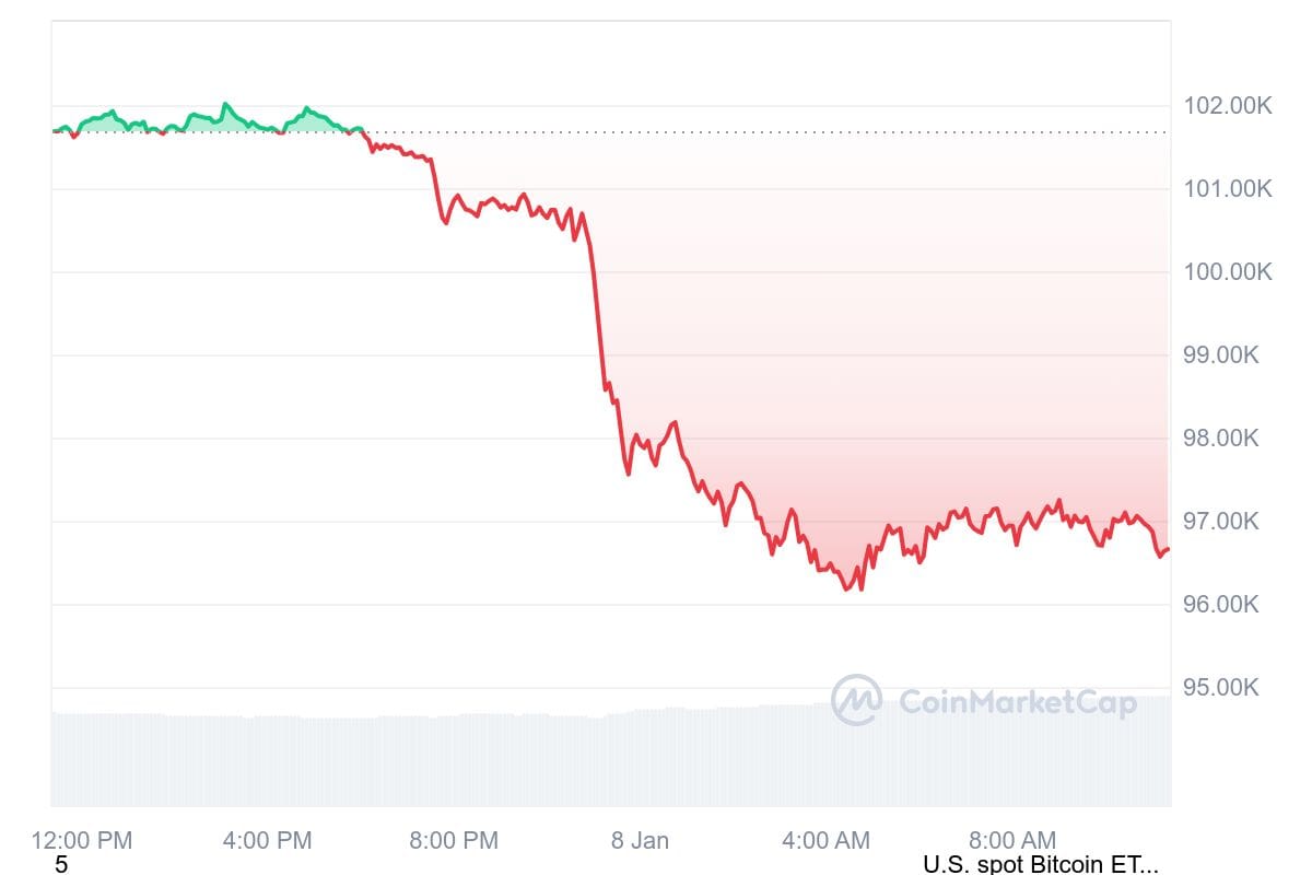 This increase, coupled with the Institute for Supply Management’s (ISM) services index showing acceleration in December activity and rising prices, signaled persistent economic strength and inflationary pressures. Treasury yields climbed in response, with the 10-year yield hitting a high of 4.699%, its highest level since April. Rising yields typically weigh on speculative assets like Bitcoin, which dropped to around $96,200, down 5% in 24 hours.