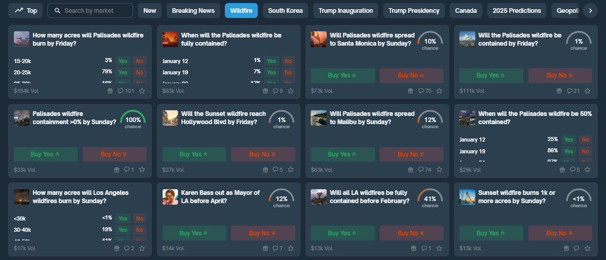 Featuring as a top trending category on Polymarket's homepage, "Wildfire" now features 19 betting pools.