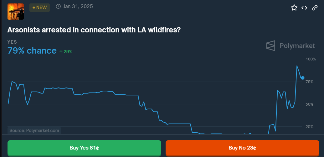 Other bets include the date that the fires will be contained, whether the fires will reach Hollywood, and if Gavin Newsom will still be Governor afterwards. Some are even betting on whether arsonists will be arrested in connection with the fires, with 79% betting on yes.