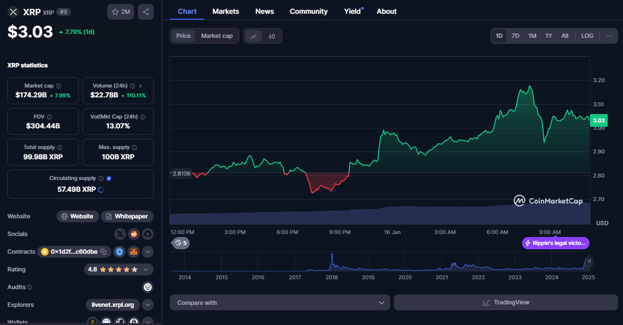 Nonetheless, XRP continues on its surge. Up 7.8% over the past 24 hours, the now-third largest crypto by market cap is up 29% over the week and more than 426% over the year.