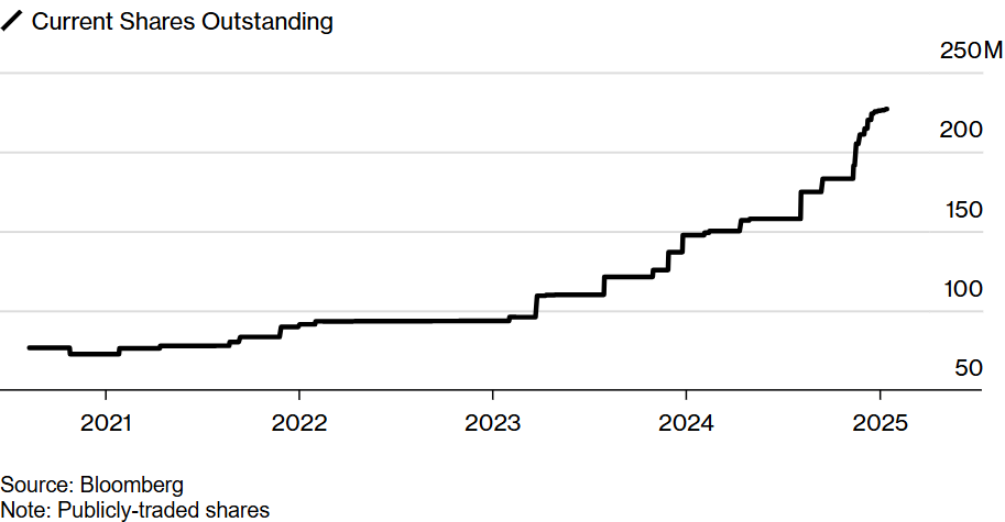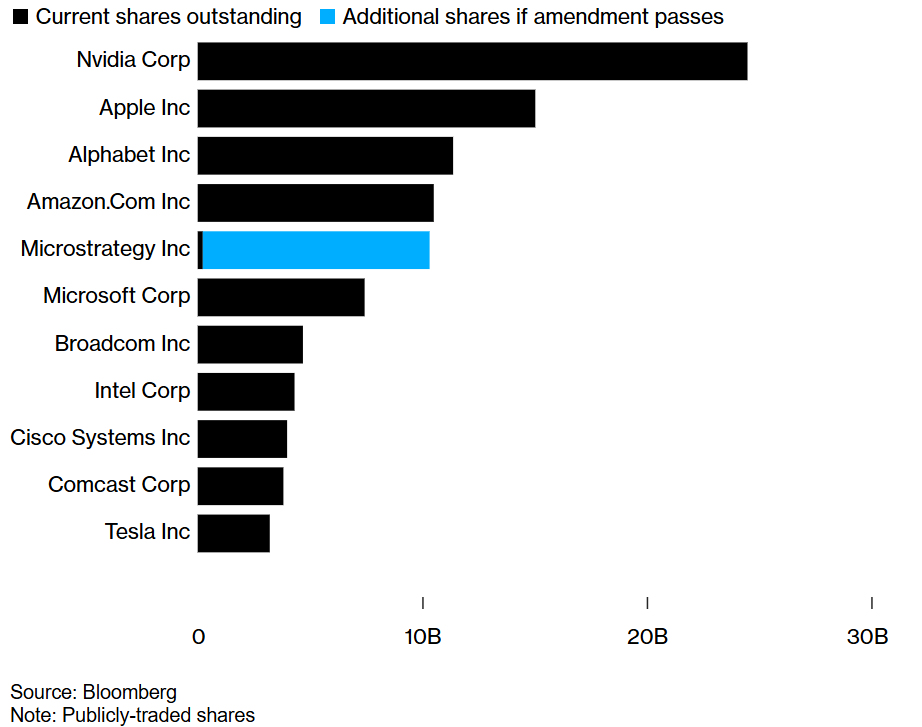 In doing so, MicroStrategy would surpass all but four of the five biggest tech companies in the Nasdaq 100 Index in terms of outstanding shares: Nvidia, Apple, Alphabet, and Amazon.