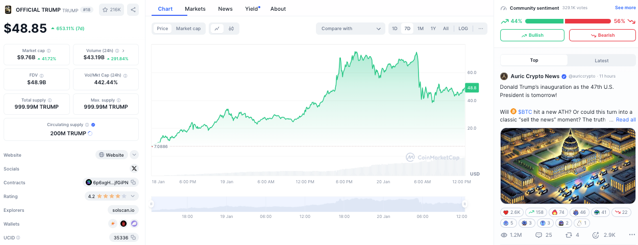 $TRUMP has since slipped to 19th place at a price of $48.88, following the launch of Melania Trump's $MELANIA token. Also built on Solana, $MELANIA jumped 2000% since its inception.