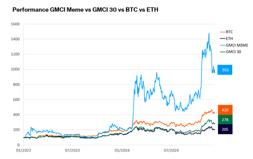 However, as ridiculous as laughable may sound, their value can't be laughed off. The GMCI Meme tracker shows that a basket of 28 memecoins drastically outperformed Bitcoin and Ethereum last year.