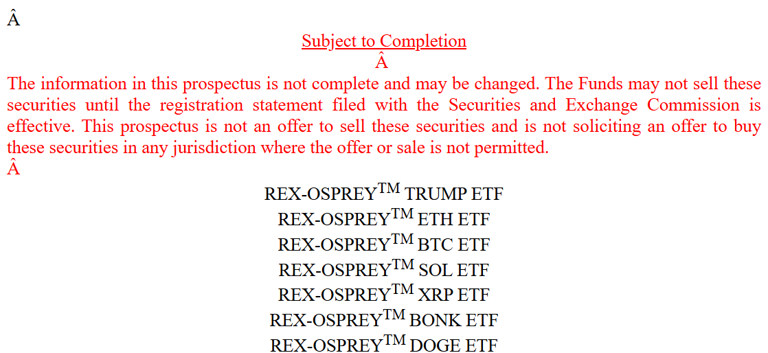 But if this wasn't degen enough, Osprey Funds and Rex Shares have filed for seven separate ETFs with the SEC including a DOGE ETF, BONK ETF and a TRUMP memecoin ETF.