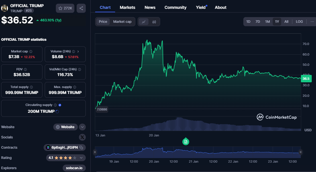 Now the 25th largest coin by market cap, $TRUMP is trading at around $37 at the time of writing, which is about half of its all-time high, achieved just ahead of Trump's inauguration.