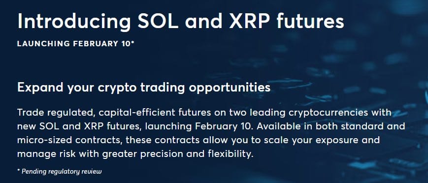 Assuming "beta.cmegroup" is actually a beta/test version of the actual CMEGroup website -- looks like CME is expecting to launch SOL & XRP futures on Feb 10. But this isn't available on the actual website yet.