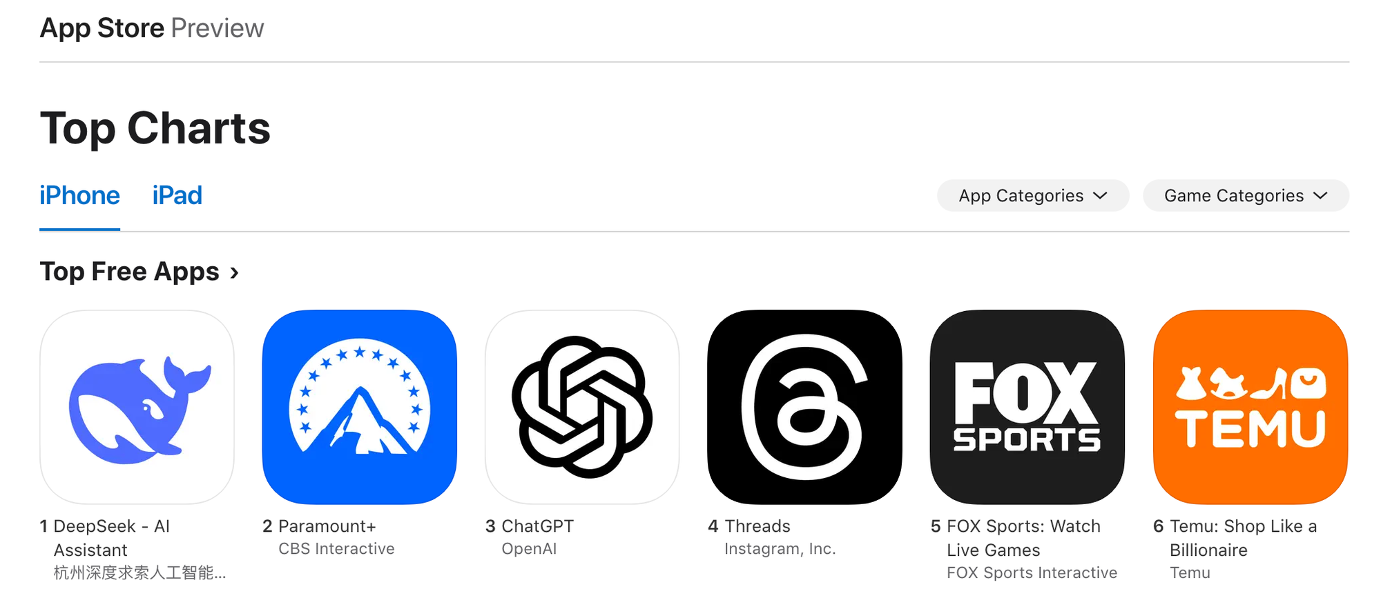 According to app data research firm Sensor Tower, DeepSeek has surged in popularity in the US since its release on 10 January and currently sits at the #1 spot in Apple's App Store.