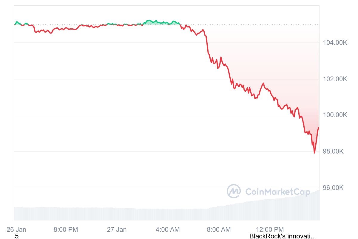 Bitcoin kicked off the week with a sharp 6% drop, shedding over $6,000 in value and rattling the broader cryptocurrency market. The leading digital asset fell from weekend highs of $105,000 below the $98,000 level, losing its $2 trillion market capitalization in the process, though the token is currently trading at $98,899.
