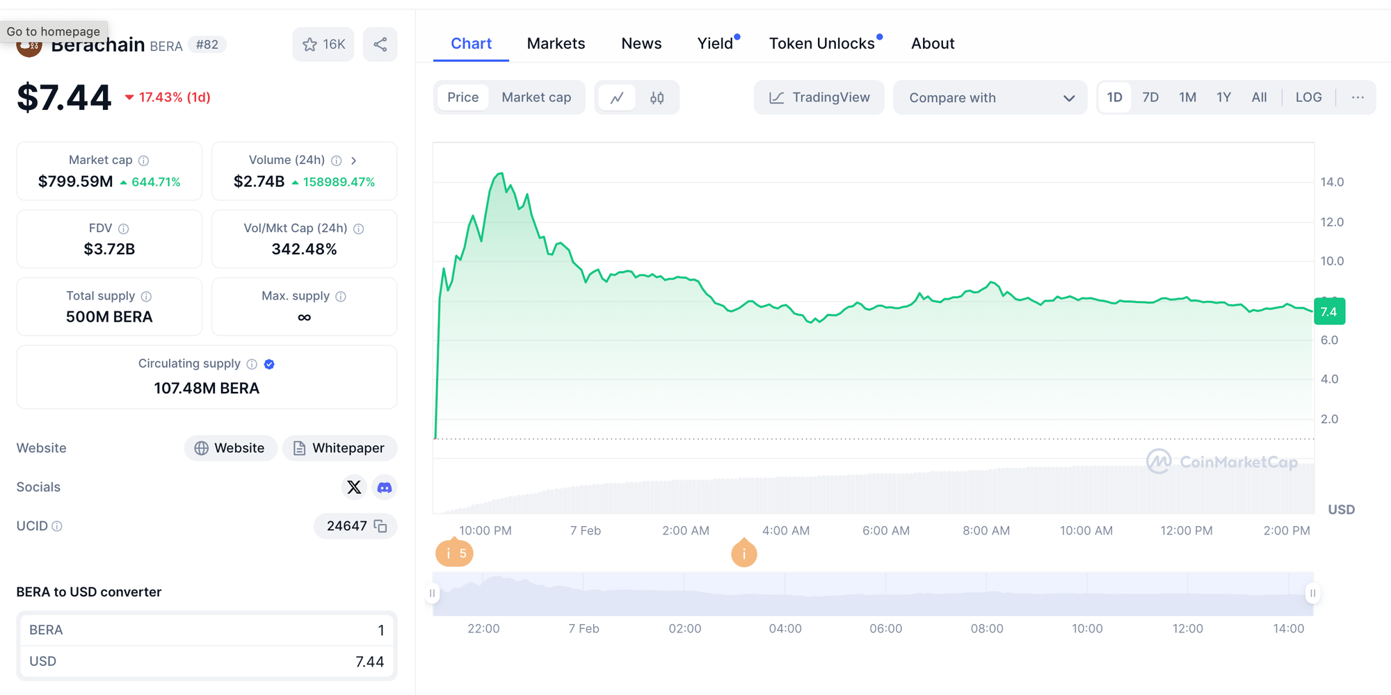 Trading for BERA went live on leading exchanges such as Binance, OKX, and Coinbase, with the token initially reaching a peak of $14.83 before settling at around $8.00, reflecting a 49% decline from its high.