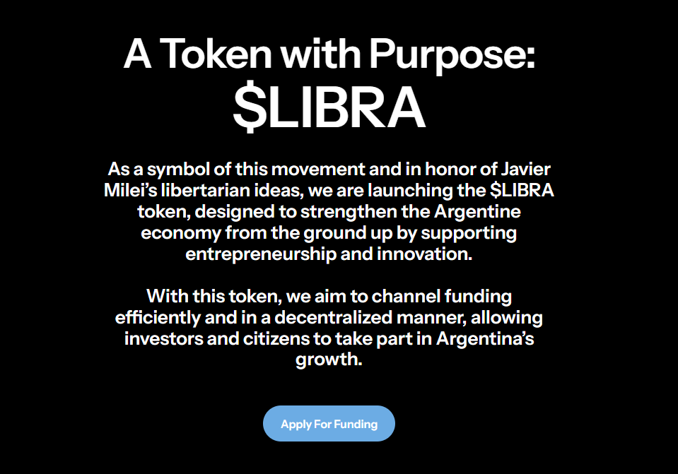 "As a symbol of this movement and in honor of Javier Milei’s libertarian ideas, we are launching the $LIBRA token, designed to strengthen the Argentine economy from the ground up by supporting entrepreneurship and innovation," the website reads.