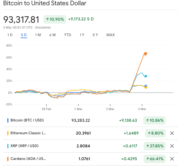 Following his announcement, XRP, SOL, and ADA jumped 30%, 20%, and 60% respectively, while BTC and Ethereum rose around 10%.
