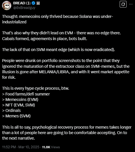 "People were drunk on portfolio screenshots to the point that they ignored the maturation of the extractoor class on SVM-memes, but the illusion is gone after MELANIA/LIBRA, and with it went market appetite for risk," he noted.