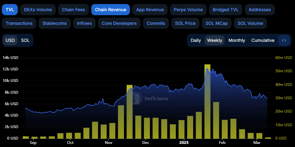 According to reports, Solana's chain revenue is down over 90% from its January highs, returning to levels not seen since September 2024. Earning an average of just $4 million per week over the last fortnight, its revenue has paled in comparison to its $38.5 million per week in mid January.