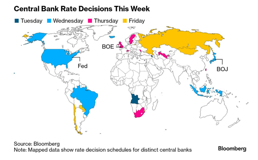 In addition to the Fed's decision, many other countries' rate decisions are due, including the Japanese early Wednesday and the Swiss and the UK later in the week.