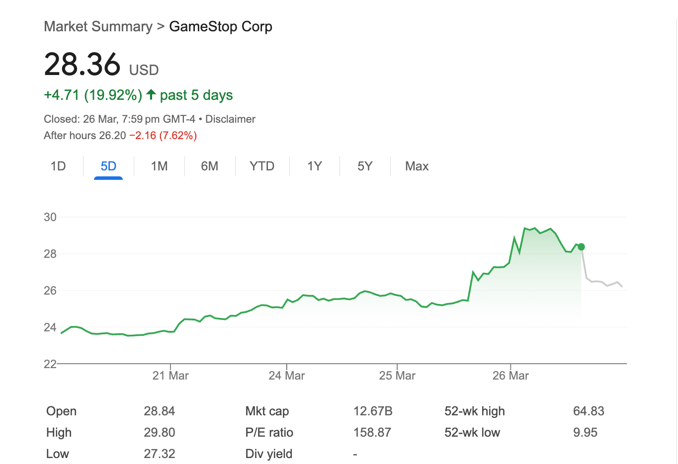 GameStop's stock closed at $28.36 on Wednesday, down 9.5% year to date.