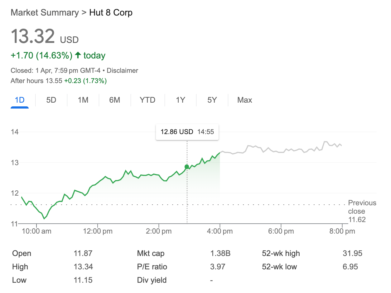 The announcement prompted a 15% surge in Hut 8's stock price to $13.32 at Tuesday's close, though it remains some 39.15% down year to date.