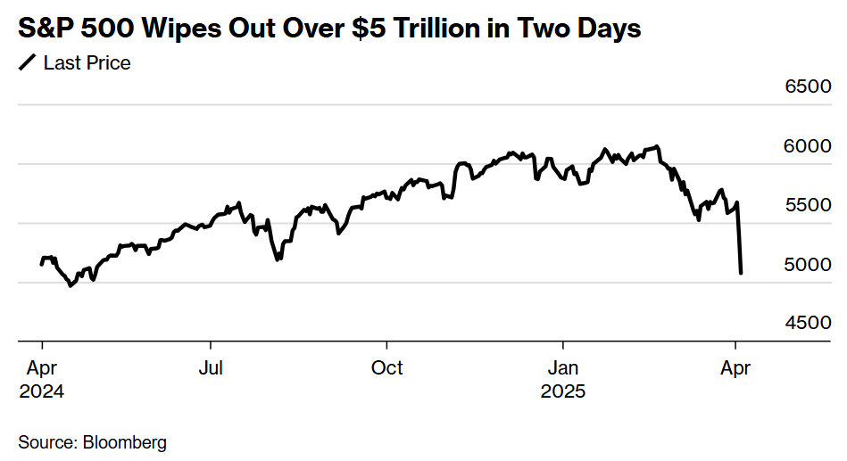 The S&P 500 lost $5 trillion in market capitalization in just two days as a result of a 6% decline, which was aided by China's retaliatory tariffs.
