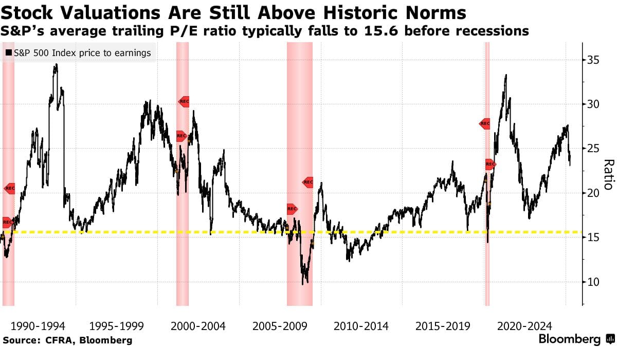 Sam Stovall of CFRA produced the following data: during routs before economic downturns, the trailing price-to-earnings ratio of the S&P 500 typically drops to 15.6. Despite the latest selloff, it is currently trading around 22.