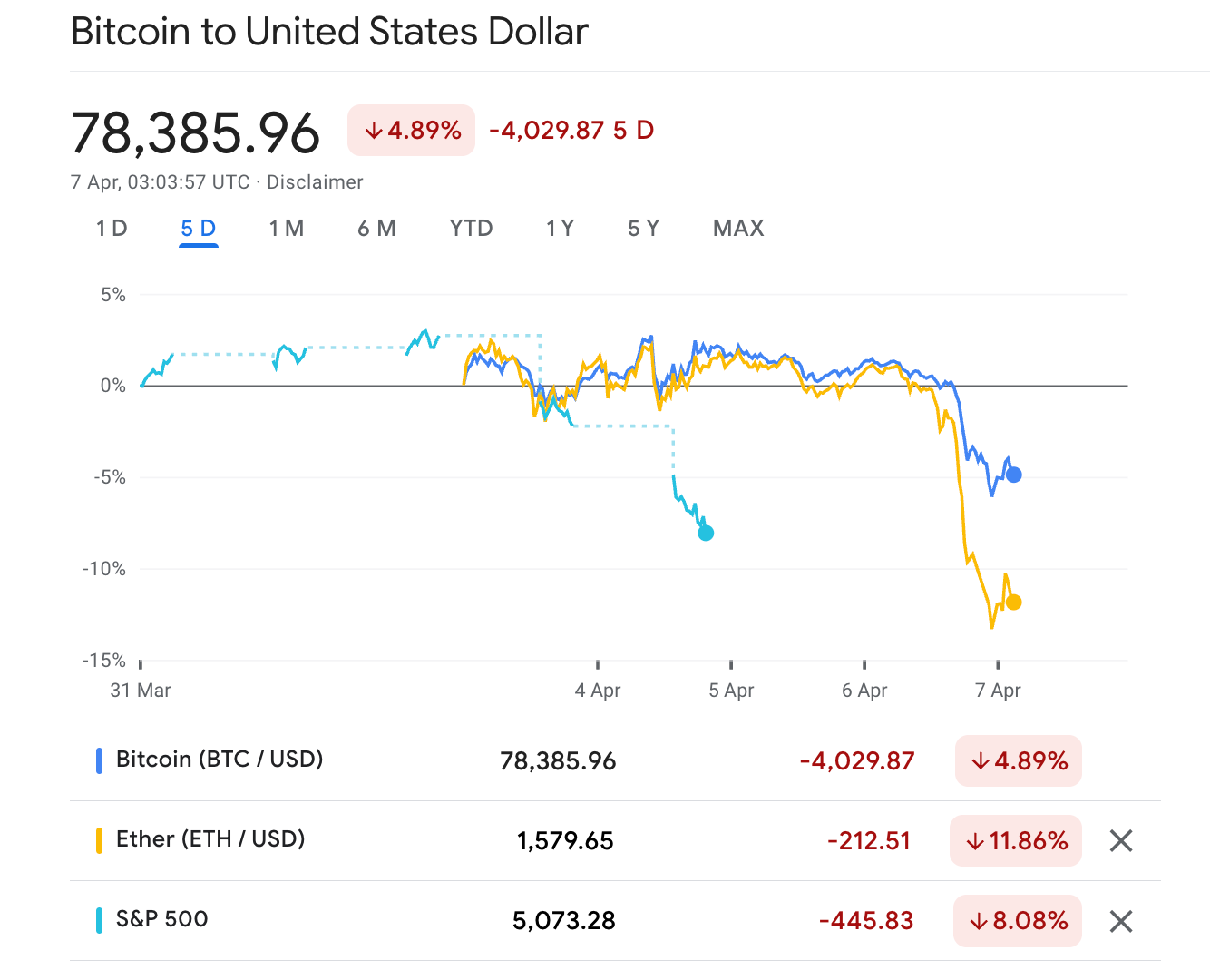 The weekend’s steep losses came after the largest 48-hour stock market wipeout since the COVID panic, with $5.4 trillion in equity value erased. The S&P 500 closed down 6%, while the Nasdaq 100 fell 5.8%, both officially entering bear markets. Risk aversion spilled into Asia this morning, with index futures sliding over 5% and crude oil breaking below $60 a barrel for the first time since 2021.