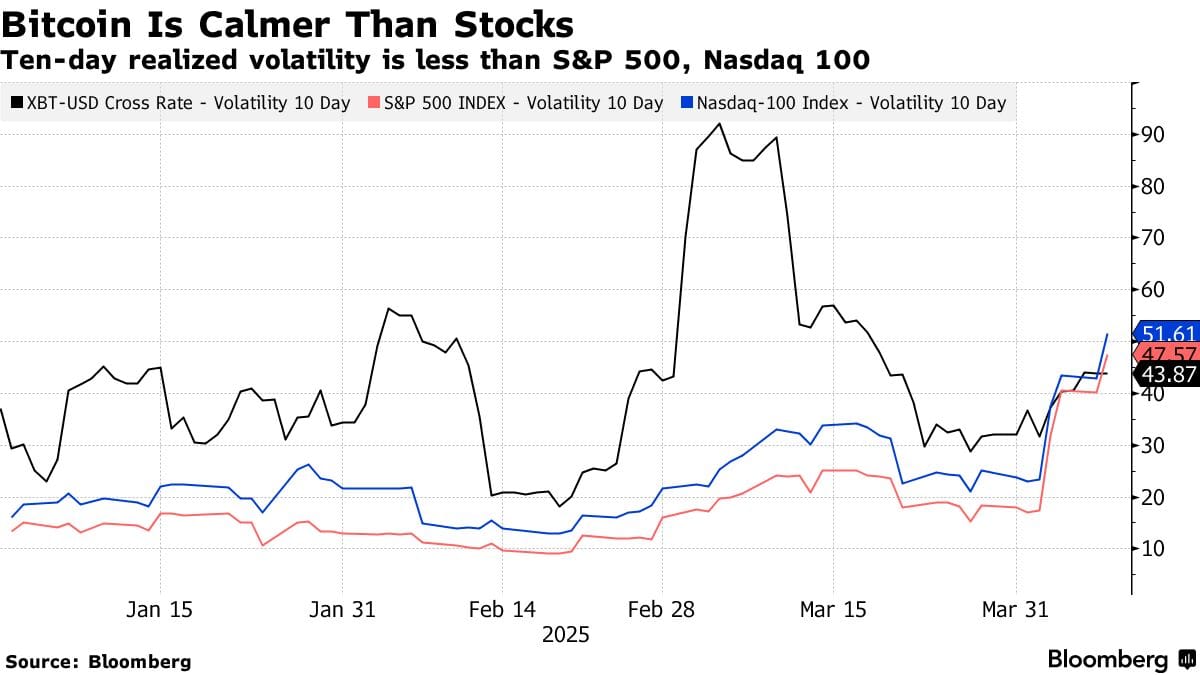The stock market has experienced unprecedented volatility as a result of President Trump's slew of tariffs on US trading partners, which has caused price swings that rival those of the oldest cryptocurrency.