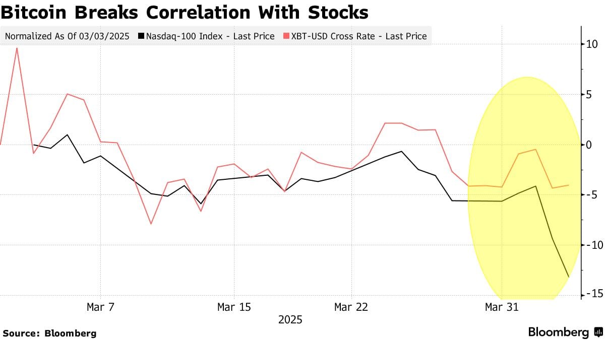However, that is fast breaking down in last week's stock crash. Bitcoin was actually up 1%, while the tech-heavy Nasdaq 100 fell for a second day following Trump's announcement of trade penalties late Wednesday.