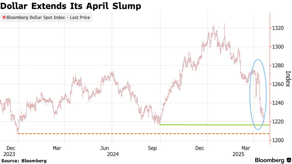 Already dropping for three weeks in a row before the president declared tariffs, a Bloomberg indicator of the dollar's strength continued to decline.