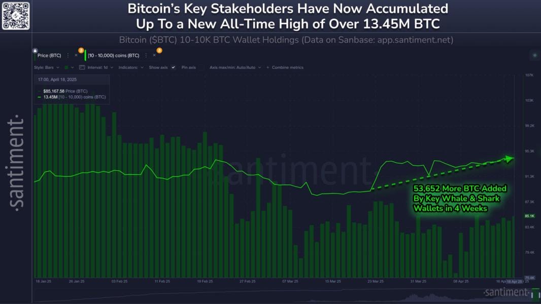 🐳🦈 Bitcoin's key stakeholders comprised of wallets holding between 10 & 10K BTC currently hold 67.77% of the entire supply of crypto's top market cap asset. During the April volatility, these wallets continue to accumulate, and have now added over 53.6K BTC since March 22nd. 👍 pic.twitter.com/eCalVW0FQf