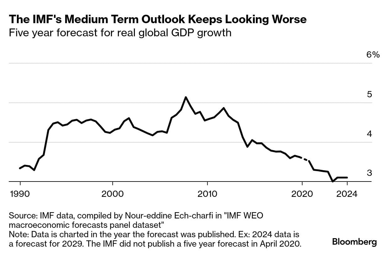 Another indicator to monitor is the decline in the International Monetary Fund's (IMF) five-year growth projection for the world over the past few years.