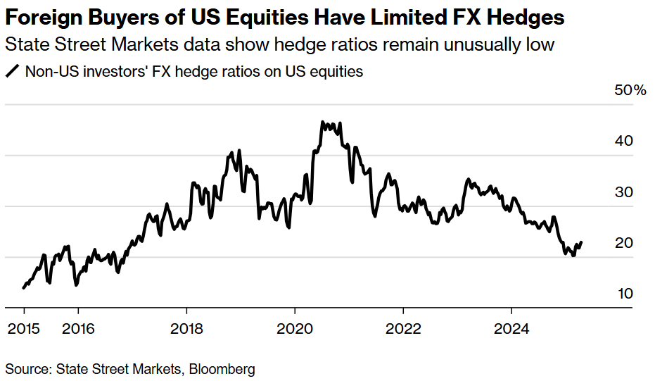 The rapid pace of developments and erratic signals from the White House are causing concern among investors who had relied on the US as a reliable safe haven and a source of significant returns. Regardless of whether Trump continues to reverse his stance and yield on the trade wars, the tumult of the previous month has revealed to numerous international investors the dangers associated with heavily investing their capital in dollars. Many are currently hurrying to incorporate currency hedges into an American equity portfolio valued at approximately $18 trillion as of December, representing nearly one-fifth of all US stocks.
