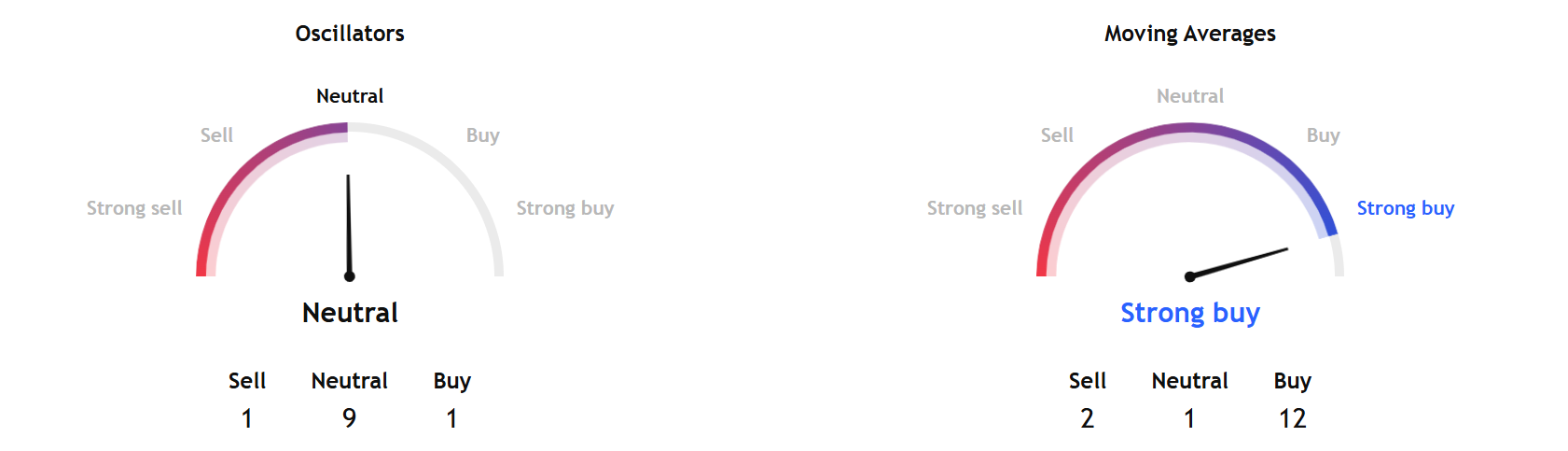 The oscillators point to a 'neutral' stance, while moving averages show a 'strong buy' signal.