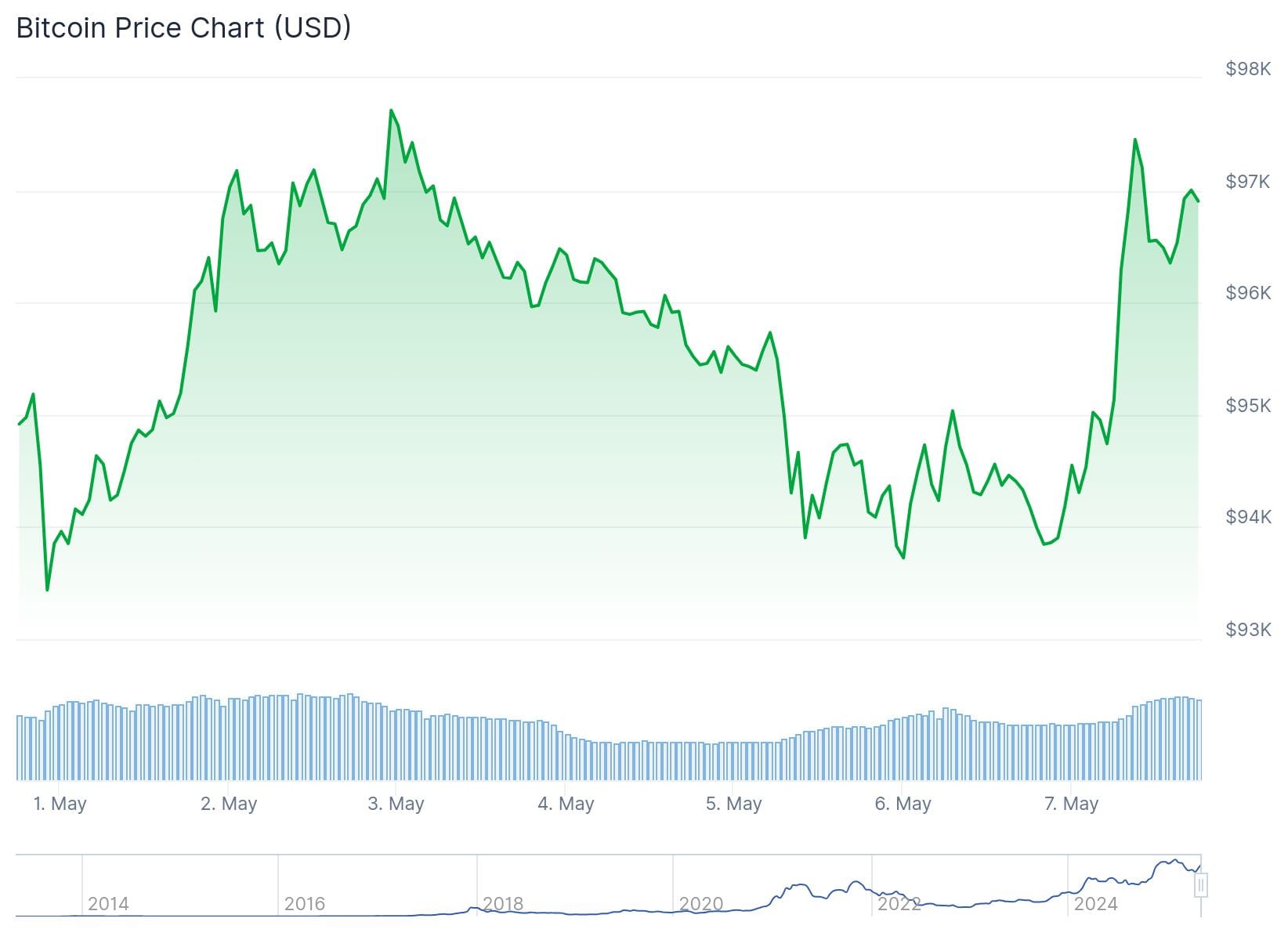 But this time, cryptos are in the sell orders, too. Bitcoin launched a test of the six-figure mark last week, but fell back to just above the $94,100 level on Monday, and is currently 2.9% up since yesterday at $96,891. This comes after breaching a 10-week high of about $97,480 last week.