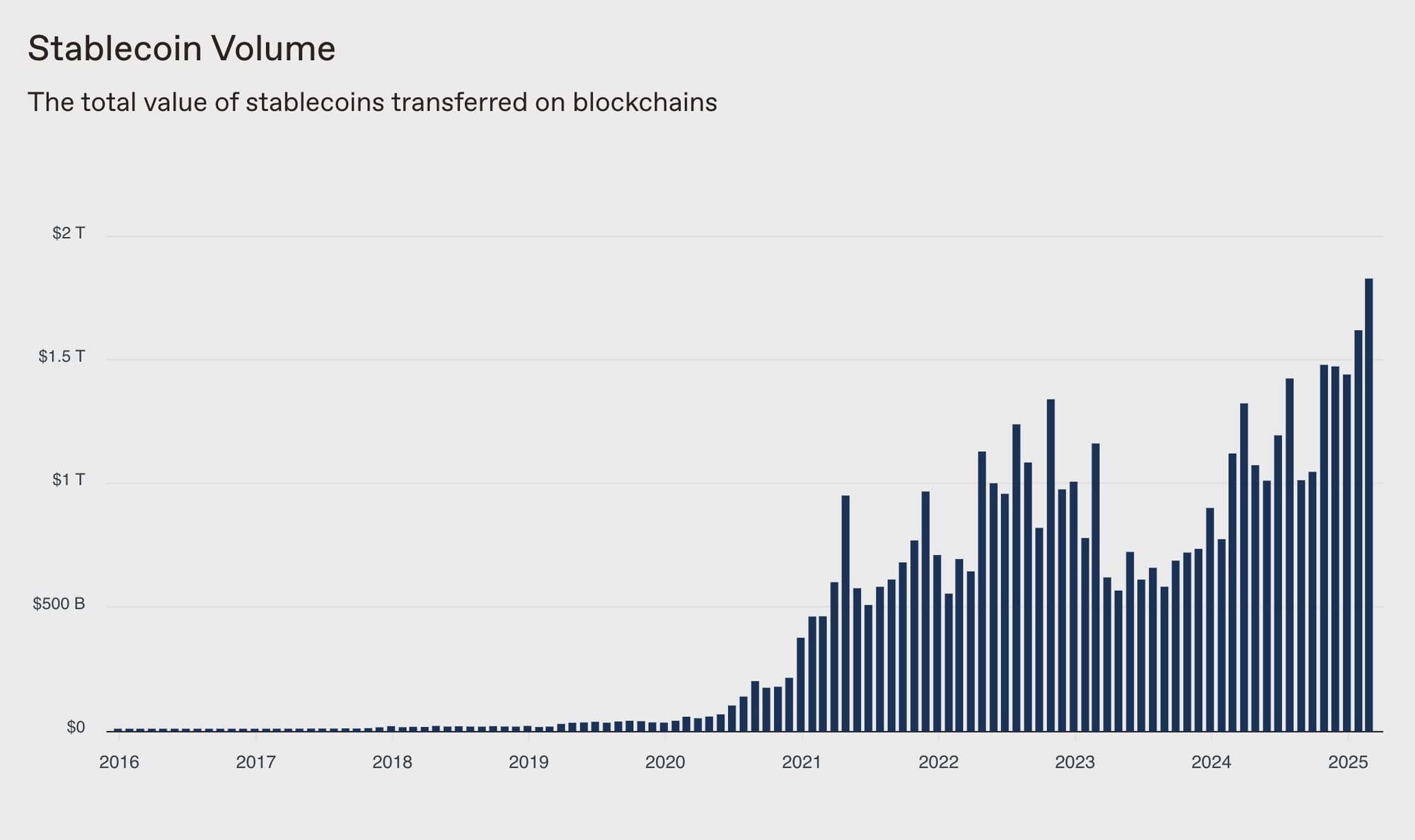 According to a16z crypto, stablecoin transaction volumes hit a record high of $1.82 trillion in March 2025.