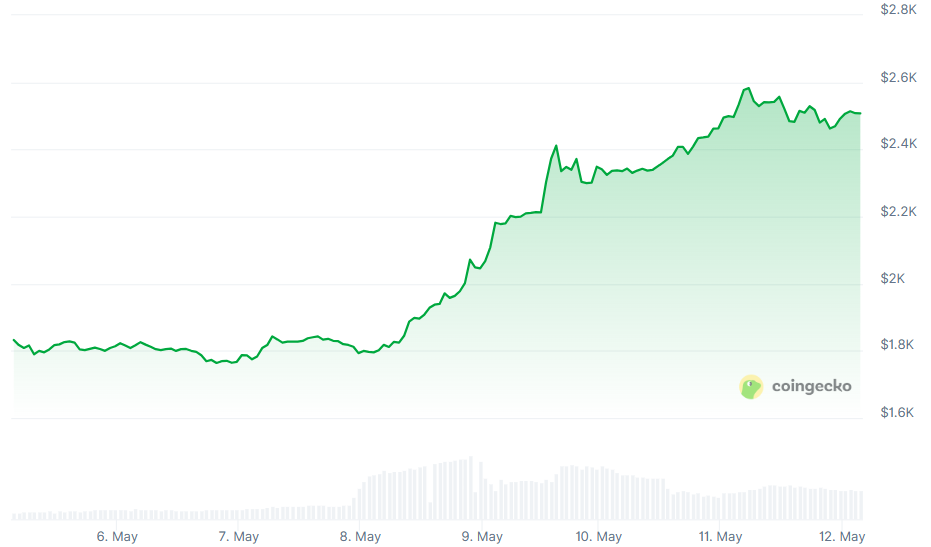 On Friday, Ether surged 14% to $2,490, resulting in a weekly gain of almost 33% for the second-largest digital currency by market capitalization. The last time the token saw something similar was in 2021, during the pandemic's crypto bubble.