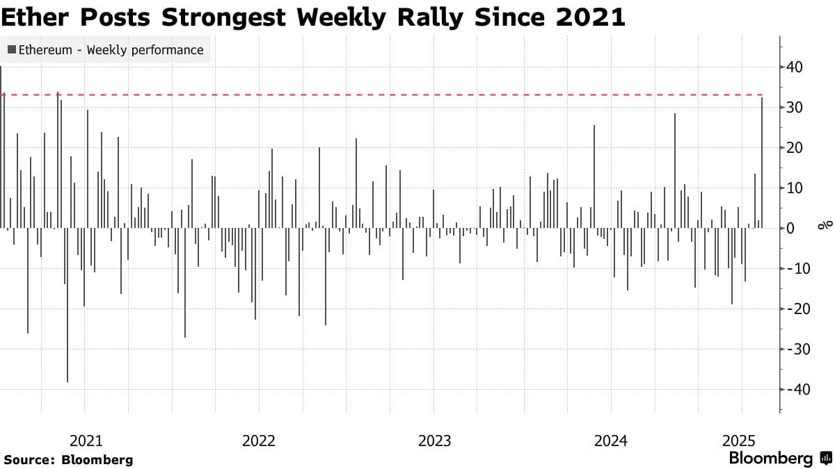 Ether led a significant rally in the cryptocurrency market last week, driven by trade deal hopes and expectations of a network upgrade. It marked its biggest gains since 2021.