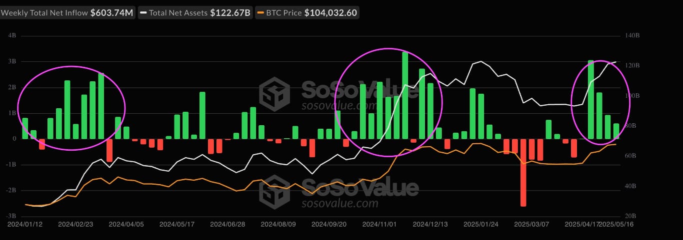 On March 14, 2024, the price of Bitcoin reached a record high of $73,800, a 73% rise over its previous low. Similarly, from October 2024 to December, Bitcoin experienced a 60% surge from $67,000 to $108,000, with cumulative weekly inflows reaching $17.6 billion.