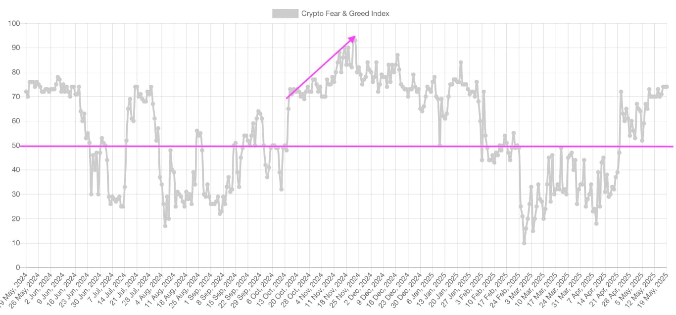 Interestingly, this degree of greedy market attitude was previously seen in November 2024, just before Bitcoin's rally to its all-time high price of $108,000 on December 16, 2024.