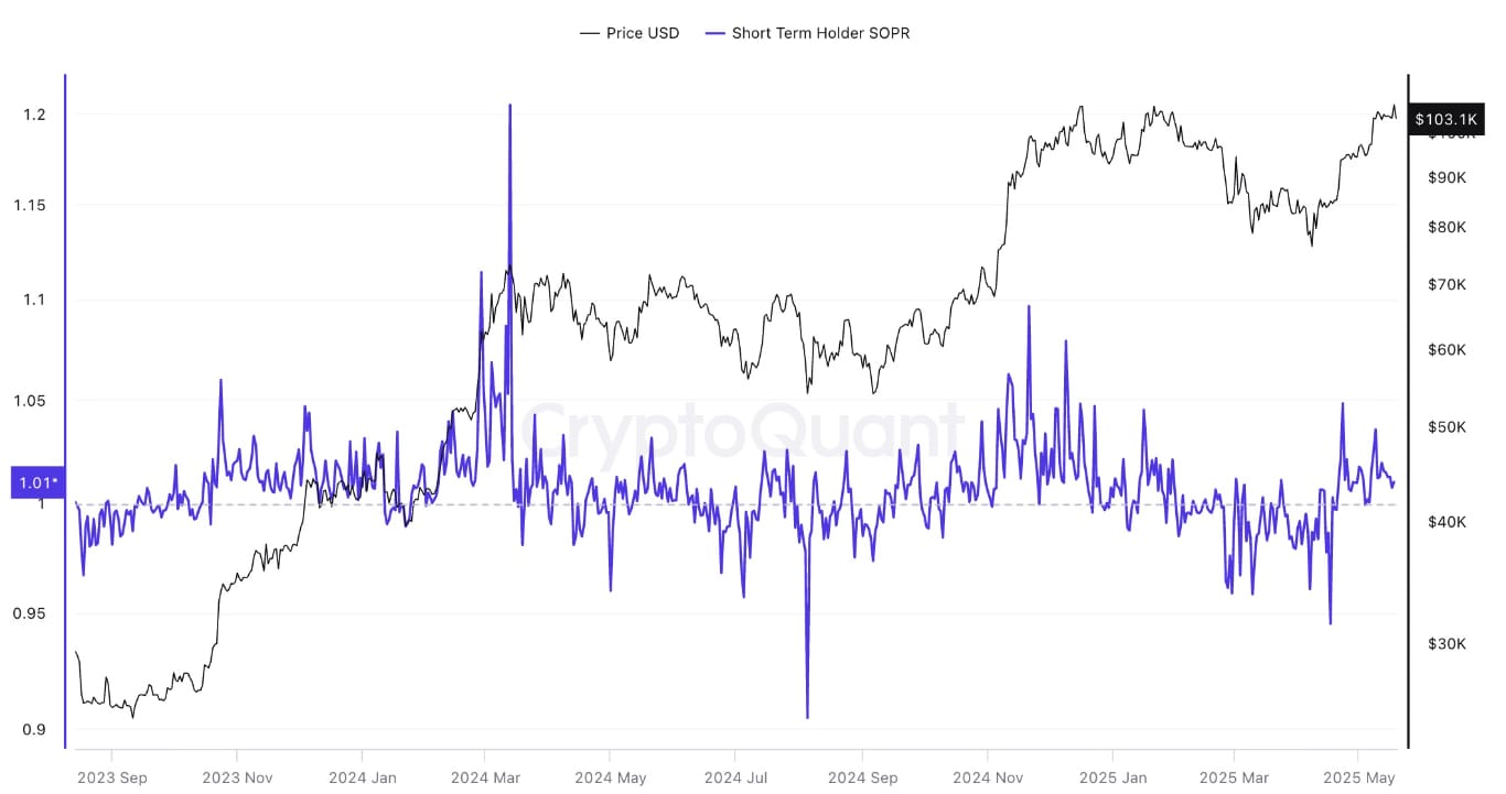 While short-term holders (STHs) are generating a profit again, CryptoQuant's short-term holder (STH) Spent Output Profit Ratio (SOPR) shows that they aren't actively booking profits. STHs can see their profit or loss relative to when they initially owned Bitcoin using the SOPR metric.
