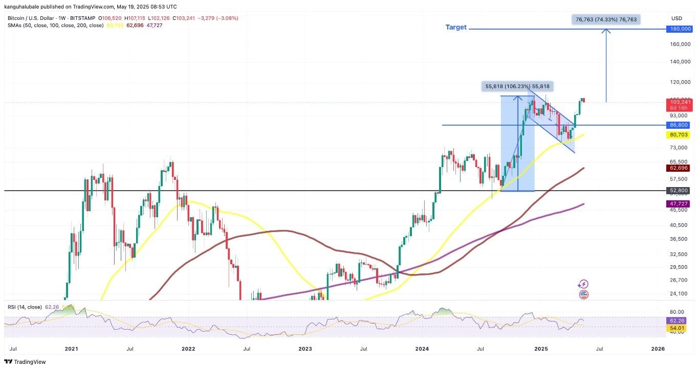 The projected upper target for BTC's price is $180,000. This would represent a 74% rise from the existing price levels.