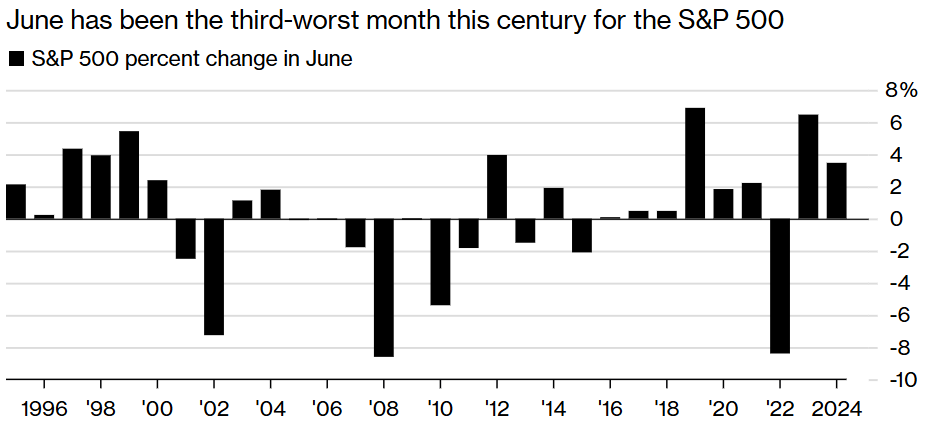 The S&P 500 has averaged an increase of just 1.8% from Memorial Day through Labor Day, dating back to the early 1970s. However, Bloomberg data shows that the S&P 500 has only lost ground in June once in the past 10 years.